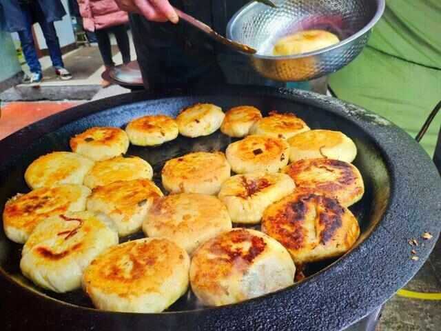 殷汇大饼,又称殷汇煎饼,是安徽省安庆市殷汇镇的特色小吃,也是安庆市著名的糕点之一。这种大饼以其薄脆香酥、色泽金黄、口感细腻、味道鲜美而著称,是殷汇镇的代表性美食。殷汇大饼的历史可以追溯到清朝末期,当时有一位姓王的糕点师傅,为了迎合当地人的口味,经过多次尝试,终于研制出了这种薄脆香酥、口感极佳的大饼。这种大饼在当地迅速流行开来,成为了当地居民喜爱的美食。