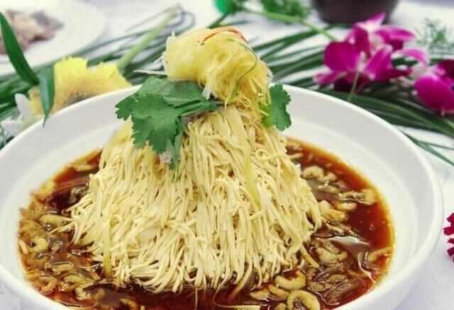 烫干丝是江苏扬州和泰州一带传统的地方小吃,早茶名点之一,色泽素雅,软嫩异常,鲜美隽永。在烫干丝中,扬州烫干丝与泰州烫干丝在原料和加工工艺上有些许不同,也形成了两地烫干丝的不同口感与风味。