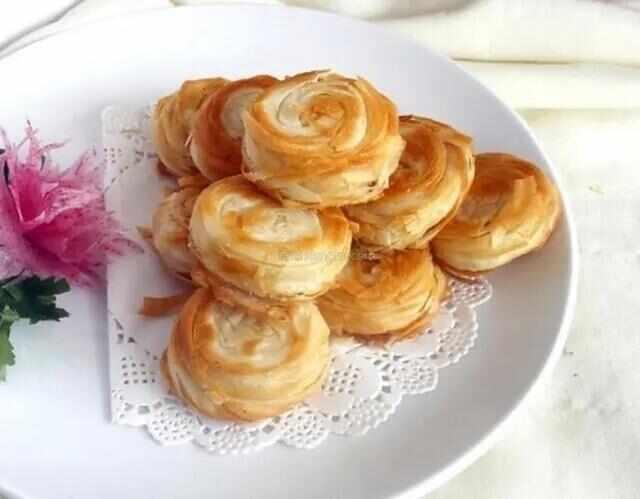 姜堰酥饼是江苏泰州姜堰地区传统饼类名小吃,是四季都能吃到的点心。它的特点是色泽诱人,口感香酥可口,层次丰富,花纹清晰。它的制作很有讲究,油酥面团卷成多层次的圆柱形,横断数截,垂直拍扁,擀成饼坯。两片饼皮之间夹以火腿、笋丁、鸡丁、虾仁等所制馅心,捏实边沿,油炸成熟。