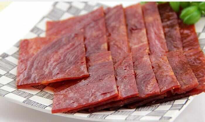 靖江猪肉脯是江苏省泰州市靖江市的一道传统名吃,属于苏菜系,该菜品以猪腿肉为主要食材,菜品色泽棕红,光泽美观,口味香甜,食而不腻,成品为片形,长12厘米,宽8厘米,每千克60片左右。
