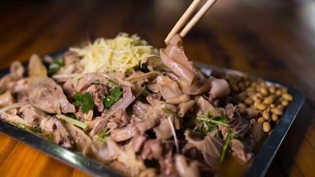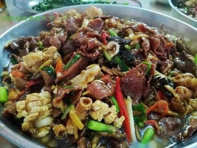 玉林炒牛杂,又叫生炒牛料、玉林牛杂烩,是广西玉林市的一道特色菜。玉林炒牛杂的做法是将牛肠、牛百叶、牛筋、牛肚等牛料切成大小均匀的形状,洒入调味料,翻盘拌匀,猛火翻炒,加入秘制酱汁,最后再拌上配菜,一碟炒牛料就热气腾腾地上桌了。这样做出来的炒牛料就很”鲜”,香脆爽口 ,“牛味”十足,营养丰富。