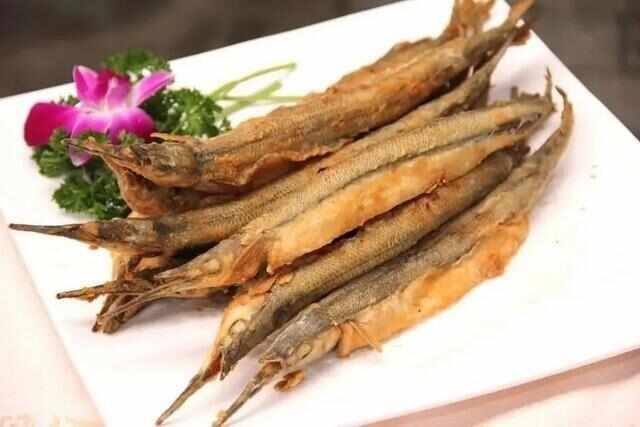 刀鱼位列长江三鲜之首。宋代名士刘宰曾作诗赞美它:“肩耸乍惊雷,腮红新出水。佐以姜桂椒,未熟香浮鼻。河豚愧有毒,江鲈惭寡味。”香酥长江刀鱼,色泽金黄,外酥里嫩,口味鲜美至极。