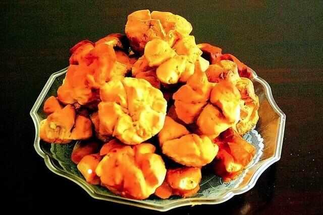 狗脚是黄冈团风镇的特产,因产品形似狗脚,故名团风狗脚。主要是用白面粉、糖稀、红糖、麻油、五香和苏打和面贴放在炉内烘坑上烘烤而成,团风狗脚的色泽金黄,松酥香甜,如用塑料食品袋装,可存放一月之久,是一种既好吃又能久存的美味小点。