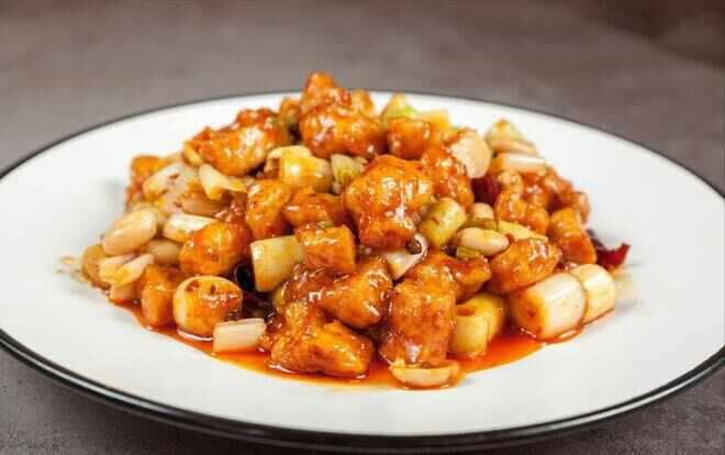 四川宫保鸡丁是一道以鸡肉为主料,干辣椒和花生米为辅料炒制而成的川菜。它的特点是色泽金黄,肉质鲜嫩,香辣可口。这道菜的花生米炒得香脆可口,与鸡肉一起入口,让人感受到香滑的口感和美味的搭配。