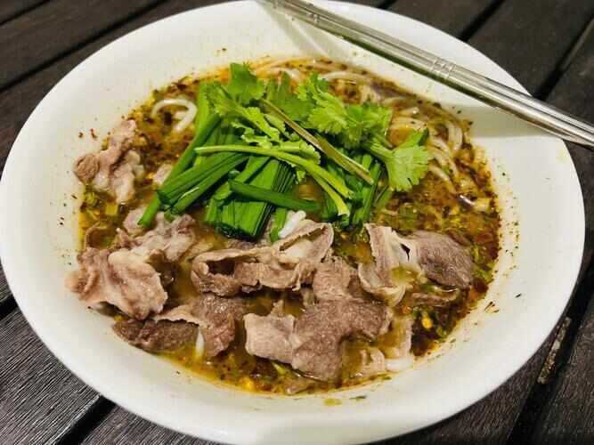 花溪牛肉粉选用优质黄牛肉熬制出鲜浓的牛肉汤。将精制米粉在牛肉汤中烫熟,再加上醇香的牛肉片和泡酸菜等佐料。品尝一口花溪牛肉粉,鲜美的牛肉与香滑的米粉完美结合,让你回味无穷。