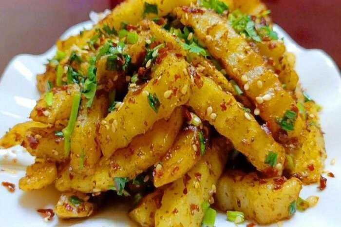 云南人对洋芋的喜爱,从一句“吃洋芋,长子弟”的俗语中就可以看出来了。在云南,洋芋的做法多种多样,只有你想不到的,没有云南人做不出来的,炸洋芋就是洋芋的热门做法,把洋芋切成块状,根据炸的时间,有生脆和软绵两种口感,根据放入的调料不同,炸洋芋的口味也多样,加入折耳根也就是鱼腥草是云南炸洋芋的经典味道。