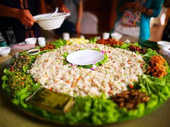 它是先在桌子上铺一层冼干净的巴焦叶,然后上菜,菜是对称摆放,菜色根据自己口味添加,一般都是傣族口味菜,米饭或紫米饭放在桌子中间。吃傣族手抓饭是不用筷子和碗的,就用手抓了吃。按传统是先从装佐料的小碟子拈出一簇,然后用手指间不停的揉捏,捏成紧紧软软的团状,然后吃掉,口味和吃法都极具特色。