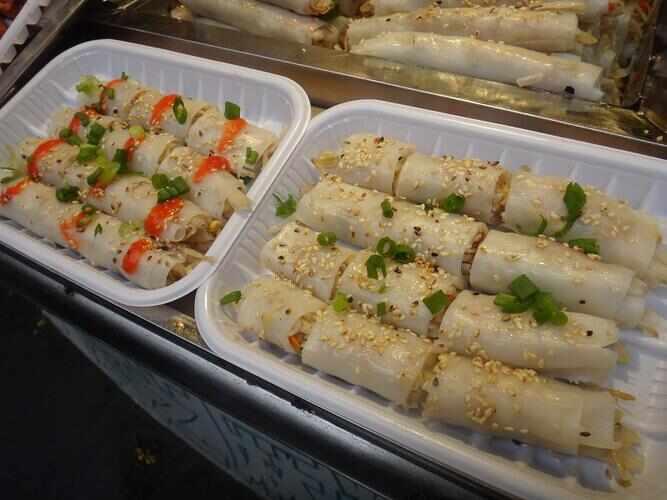 蒲塘卷粉,已有一百多年的历史,以其洁白、薄亮、嫩滑、柔韧、吸味力强、耐煮耐嚼等特色而誉满玉林。蒲塘湿卷粉用优质纯白粘米为料,充分泡浸后,经石磨磨成嫩滑的白米浆。根据当时的气温高低和制作时间的长短,先取10%的米浆用水冲熟或半熟,使与生米浆充分搅拌后待蒸。蒸制时忌用金属器具,常用两个以篾青织成的簸箕,轮流使用。蒸粉前,先在簸箕底部涂上薄油,再勾上适量米浆,荡匀,放蒸笼猛火蒸2分钟至3分钟,浆熟透即可取出。用另一簸箕盛米浆继续蒸,蒸出的粉稍凉后,涂上一层面油,即可从簸箕中撕出,挂上竹竿,散热后,折叠待用。