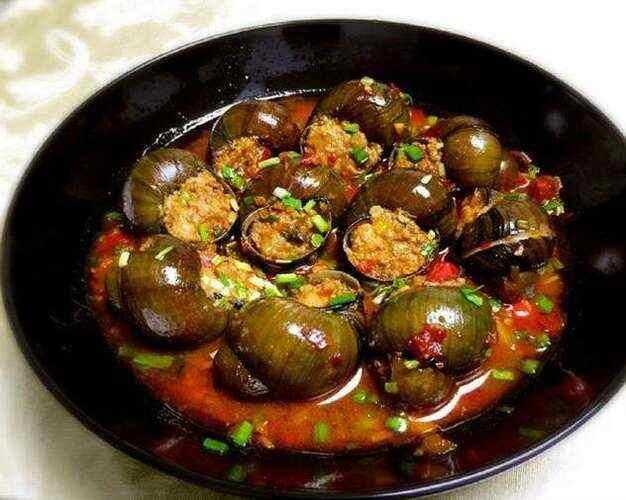 海鲜大肉田螺是广西玉林十大特色小吃之一,先上好的大田螺,敲掉螺尾煮熟,将猪肉、木耳等配料剁成馅酿入田螺内,再和鸡肉、螃蟹一同下锅煮熟即可。其特点是味美鲜甜,营养丰富。