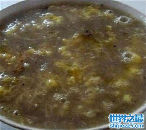 这道菜外地人听名字的话,会感到十分的奇怪,但对当地人来说却相当熟悉,是吃早餐时经常喝到的一个汤,具体的做法,就是在汤中加入打入鸡蛋,然后混入豆腐了,白菜了之类的,再加上当地特有的胡椒粉,喝起来让人浑身都很暖,酸酸辣辣的,口味很好