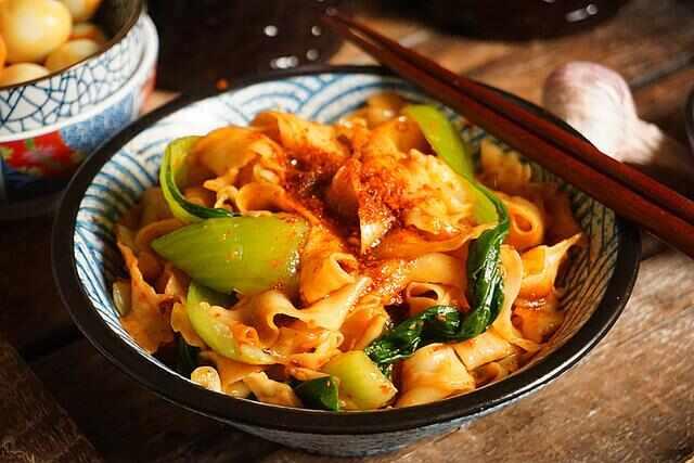油泼面是西安的传统美食之一,以面条和特制的辣椒油为主料,口感鲜美,辣味十足。这道美食以其独特的制作工艺和辣椒油的香辣味道而广受喜爱。