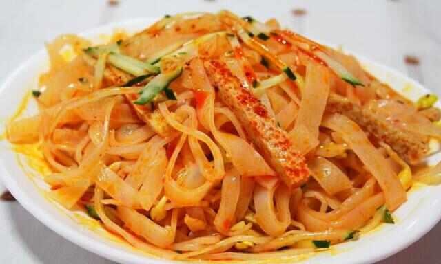 天水面皮也是天水市著名的地方风味小吃之一。在夏秋炎热季节里,一碗清爽滑嫩的面皮浇上特制的调料汁儿,再撒上香菜、黄瓜丝等配菜,每一口都是清爽与美味的碰撞,让人欲罢不能!