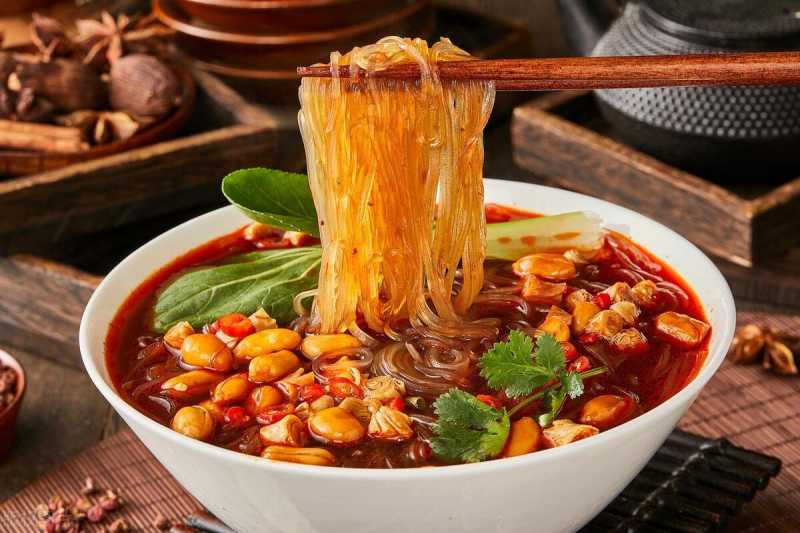 湖南酸辣粉是湖南的传统小吃之一,以红薯粉为主料,搭配酸辣汤汁和各种调料,味道酸辣可口。