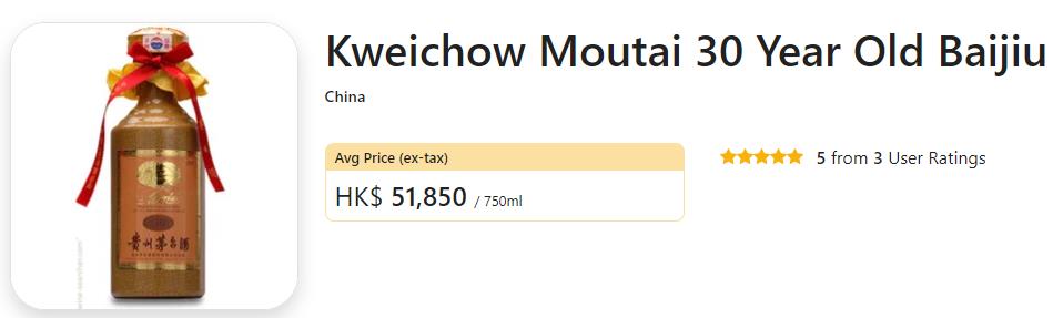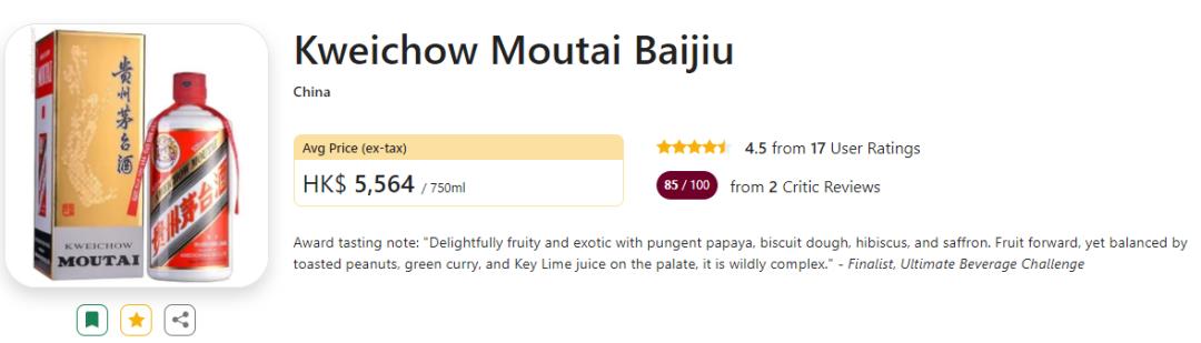 贵州茅台白酒在 Wine-Searcher 上的综合评论分数为85分。每瓶平均售价约5068元人民币 (704 美元)。