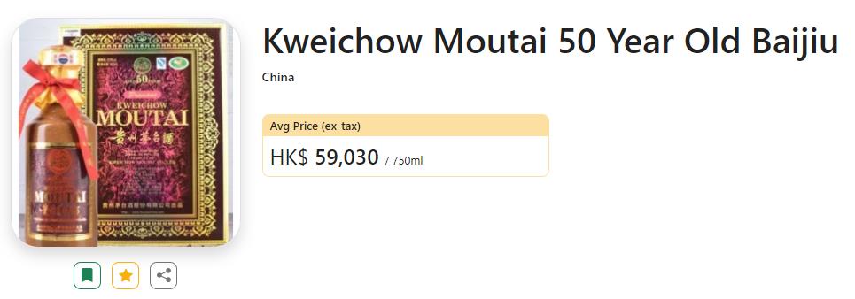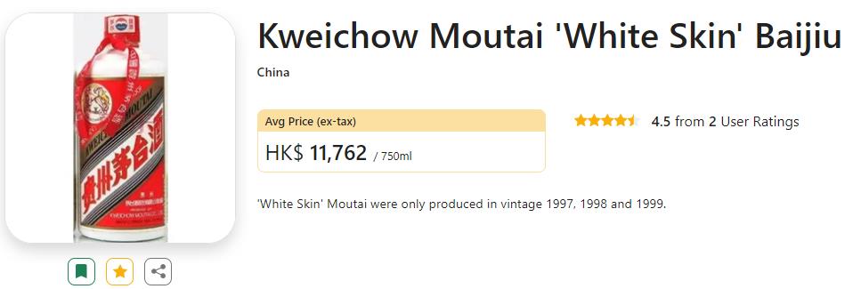 目前,Wine-Searcher 上仅列出了一款白皮茅台酒的报价,平均售价为 1503 美元,约10820元人民币。