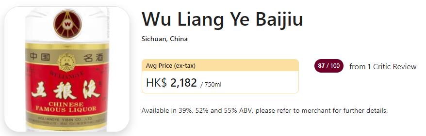 五粮液白酒非常受欢迎,而且很容易买到,在Wine-Searcher上,五粮液的平均售价为276美元,约1987元人民币。
