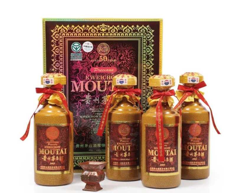 排在第四位的是贵州茅台50年的年份白酒。茅台集团从1997年开始,正式生产30年和50年的年份白酒,从1998年开始生产80年的年份白酒,1999年开始生产15年的年份白酒。