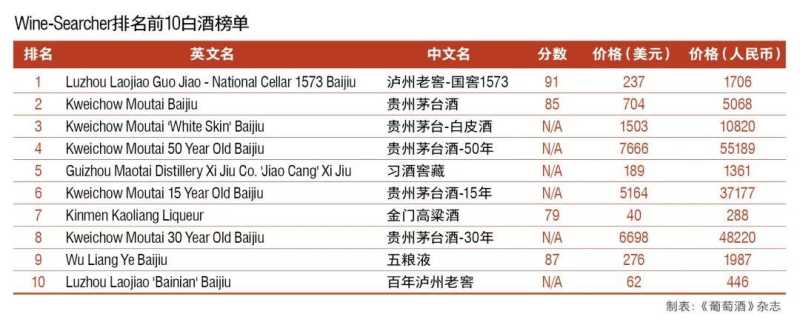 近日, Wine-Searcher葡萄酒搜索平台根据数据库最新的数据,整理出了一份世界上最受欢迎的前十名白酒榜单。在这份榜单上,价格最低的白酒仅为288元,贵州茅台虽然帮上有名,但并非在榜首位置。五粮液虽然在国内非常知名,但却是在今年才登上Top 10榜单……