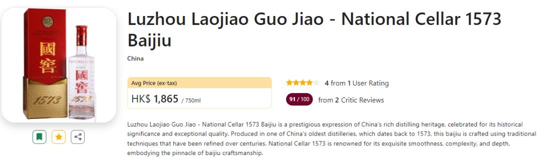 国窖 1573 白酒在 Wine-Searcher 上的综合评论分数高达91分,每瓶平均售价约1706元人民币(237美元)。