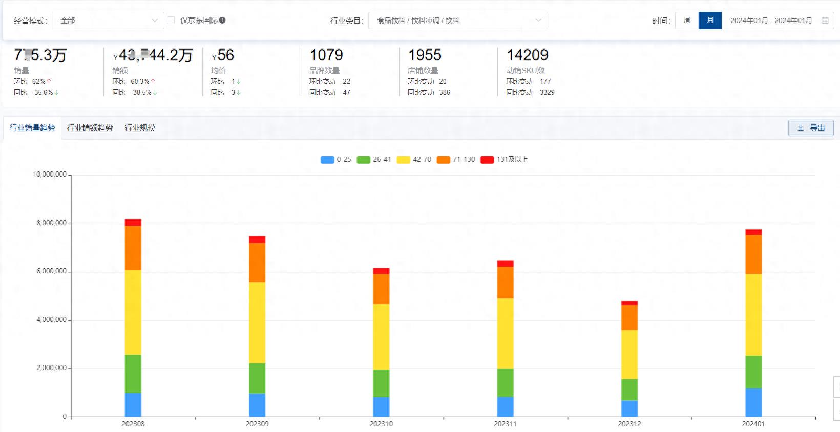 根据鲸参谋电商数据分析平台显示,今年1月份,某东平台上饮料的销量约770万件,环比上个月增长62%,同比去年下滑35%;销售额约25亿元,环比上个月增长约60%,同比去年下滑38%。