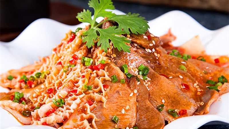 4.夫妻肺片:将煮熟的牛肺和牛舌切成薄片,摆放在盘中。锅内放油烧热后加入豆瓣酱和花椒炒香,再放入姜蒜末和酱油炒匀,最后将调料浇在肺片上。
