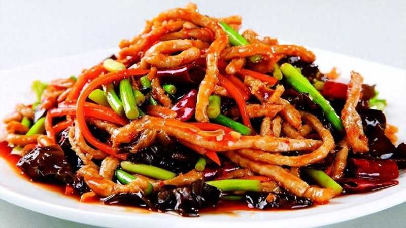 8.回锅肉:将鲜肉煮至八成熟后切片,锅烧热后加入肉片翻炒,待肉片打卷后加入豆瓣、豆豉和配菜,炒熟即可。