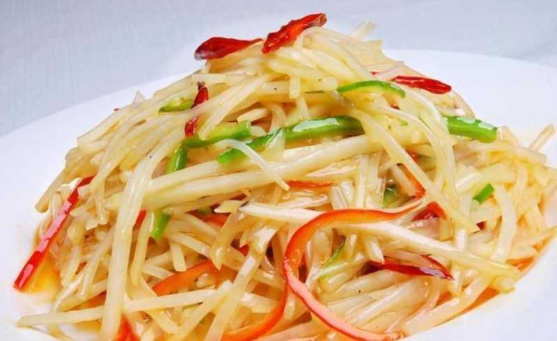 7.酸辣土豆丝:将土豆切成细丝,放入盐水中焯熟后捞出沥干水分。锅内放油烧热后加入干辣椒和花椒炒香,再放入葱姜蒜和土豆丝翻炒,最后加入醋、糖、盐和鸡精炒匀。