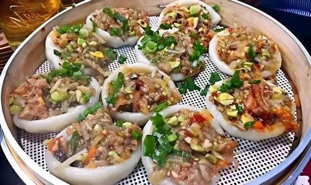 灯盏粿是江西省上饶市铅山县的地方特色小吃。因外形呈灯盏状而得名,外皮由大米制成,中间添馅,馅大多数有新鲜香菇,鲜猪肉,黄豆芽,鲜竹笋等(也可因个人口味不同酌情增减),最后放入竹制小蒸笼中用大火蒸半小时左右即可,色香味俱全,食后回味无穷,齿颊留香。