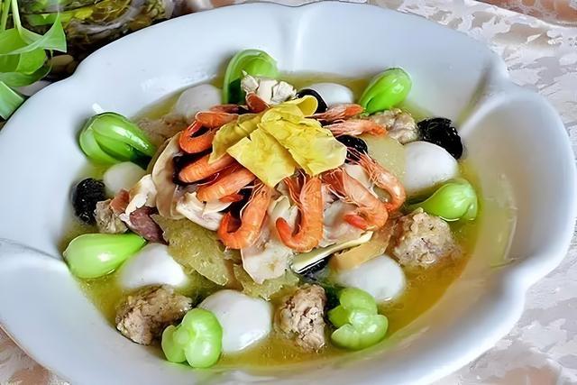 绍三鲜是绍兴的传统名菜,这道菜对食材的选择十分讲究,要选用稽山放养的土猪做成肉圆,用绍兴特有的越鸡炖汤,用鉴湖钓的鱼做成鱼圆,再加上新鲜的各种蔬菜、火腿等一起用汽锅蒸制而成。吃起来鲜美无比,被称为是“绍兴头牌菜”。