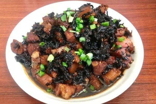 干菜焖肉是浙江绍兴一带的民间传统风味。干菜焖肉的主要原料,朴实无华,烹制方法也比较简单。其主要原料为绍兴特产霉干菜和猪肉。烹制时,将加工好的原料和调料放在碗中蒸熟。经过一定的火候,霉干菜乌黑发亮,鲜香油润,猪肉则香而不腻,咸鲜入味。一上席便可闻到菜肉的独特香味。