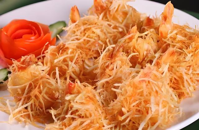 绍式虾球又名蓑衣虾球,是浙江绍兴的地方传统名菜,属于浙菜系。此菜色泽金黄油润,质地香松酥脆,配以葱白段与甜面酱蘸食,味道颇佳。因其风味独特而久销不衰,后经厨师进一步的研究改制发展而成现今的绍式虾球。