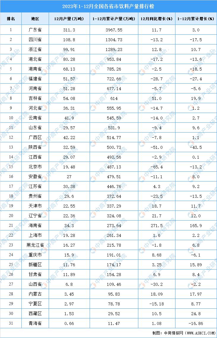 2023年全国各省市饮料产量排行榜