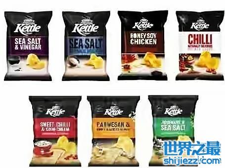 KETTLE·薯片这个来自美国的薯片在世界上最好吃的薯片排名中是一个制作很粗糙的薯片,直接将土豆切片,然后进行烘焙来制作,之后再加入各种不同的味道,但就是这样简单的制作却完美的保留了薯片的美味。