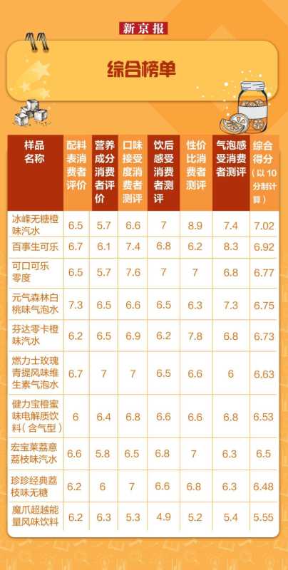 测评显示,冰峰无糖橙味汽水以价格、饮后感受度、气泡感等项目综合得分排第一。可口可乐零度、百事生可乐在口味接受度、代糖口味等方面较受消费者欢迎。魔爪超越能量风味饮料作为一款能量型饮料,口味、性价比、气泡感等方面在消费者测评中垫底,健力宝橙蜜味电解质饮料(含气型)配料表方面测评得分最低。总体而言,10款气泡水在各个项目有不同的表现,消费者更喜欢口味还原度高、气泡感充足的产品,配料表也越来越受消费者关注。