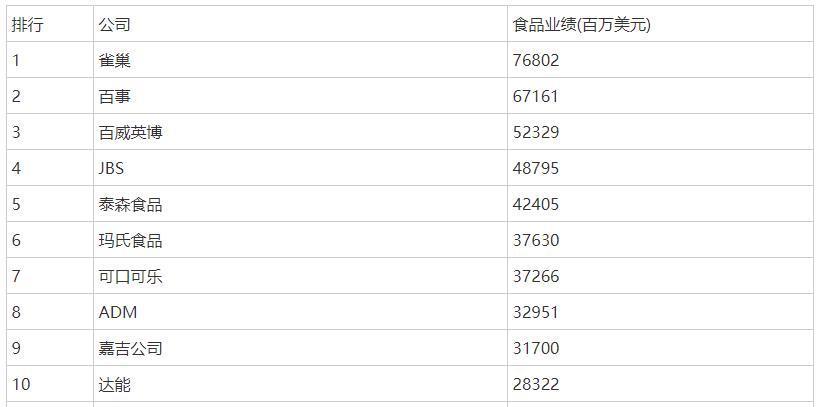 全球排在第九名的是嘉吉公司(Cargill),食品业绩为317亿美元。总部位于美国的明尼苏达,是一家集食品、农业、工业产品及服务为一体的多元化企业集团。产品包括玉米淀粉、高果糖浆、葡萄糖浆、麦芽糖浆等,广泛应用于饮料、乳品、糖果、焙烤食品;ADM排在第八名,食品饮料年收入约329.51亿美元。其优势是把谷物和油籽原料深加工成为用于食品业、饮料业、以及畜牧饲料市场中的多种产品。