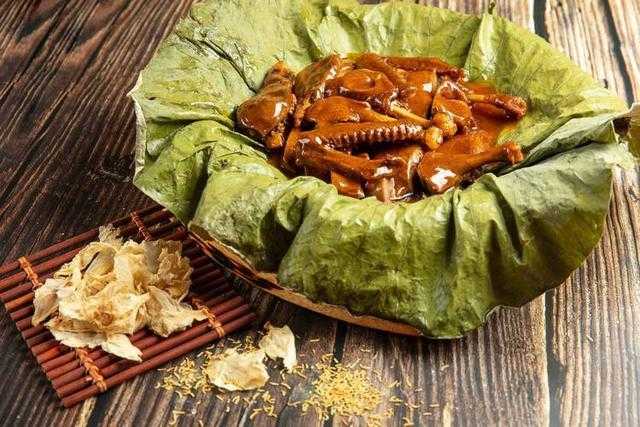 荷叶鸭,选用肥美鸭子,佐以多种调料,用荷叶包裹后蒸制而成。荷叶的清香渗透鸭肉,使之肉质鲜嫩,香味扑鼻,是一道色香味俱全的佳肴。