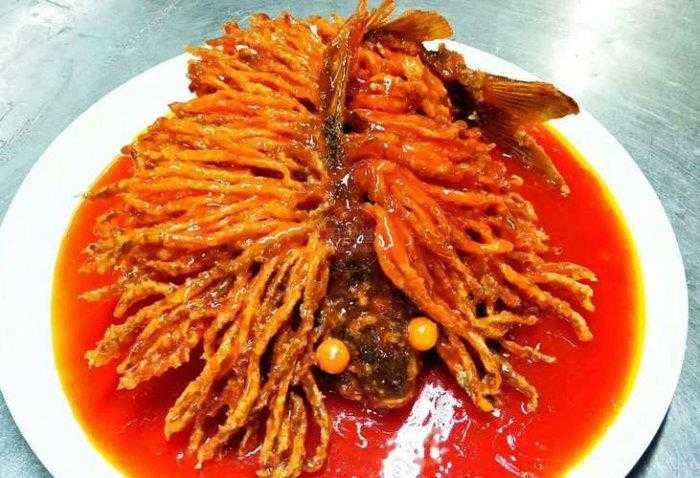 金毛狮子鱼是一道河北石家庄的传统名菜,属于冀菜系。该菜品历史悠久,最早由石家庄市的中华饭庄名厨袁清芳创制。金毛狮子鱼以鲤鱼 为主要材料。用鲤鱼加工修饰后,炸制而成。色泽金黄,鱼丝蓬松形似狮子,酸甜适口。金毛狮子鱼不仅味道鲜美,其营养价值也十分丰富。