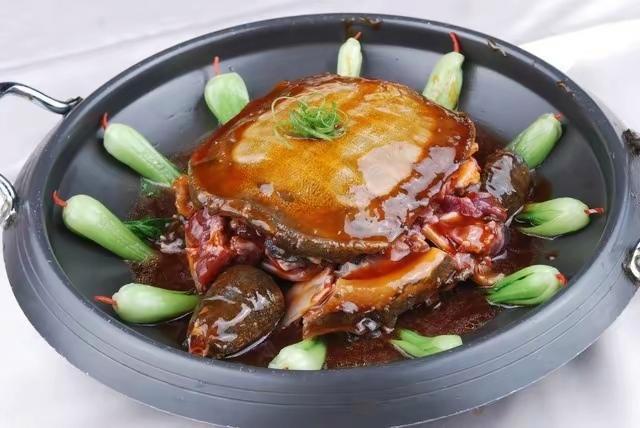 冰糖甲鱼,别称独占鳌头,是浙江宁波地区最著名的传统菜肴,口感鲜美肥腴,有入口甜收味咸的特点。