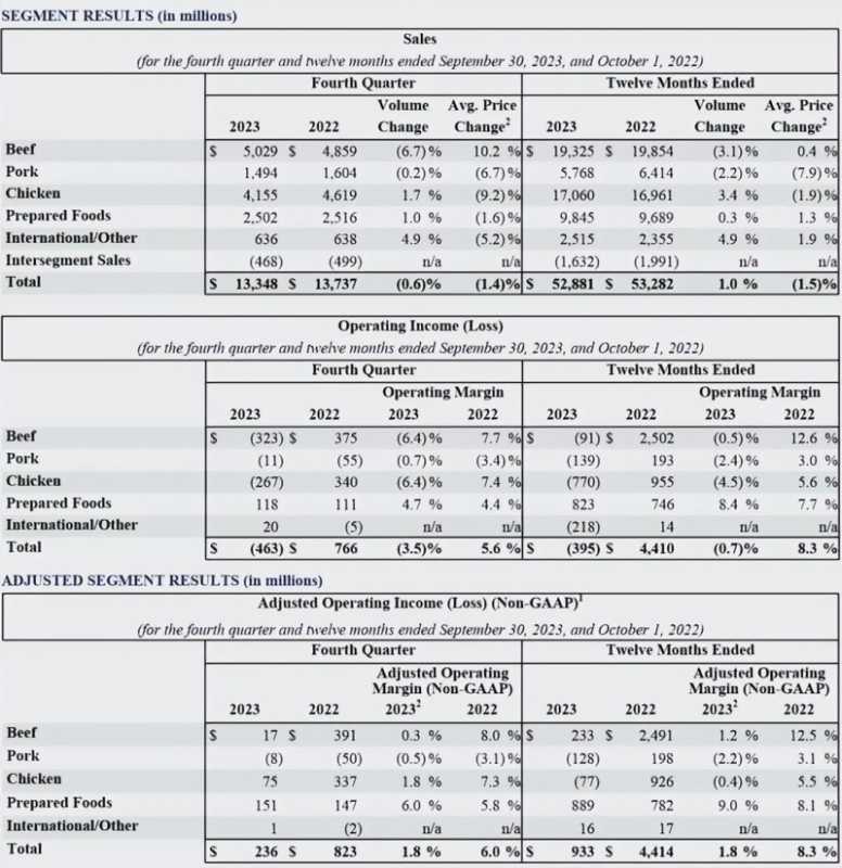 泰森食品表示,由于鸡肉和猪肉价格下跌以及牛肉需求疲软,第四季度收入也下降了2.8%,至133.48亿美元。而食品价格上涨和利率上升给家庭预算带来压力,一些美国人正在减少牛肉等高价肉类的消费。泰森表示,因为价格上涨了10.2%,其牛肉业务在第四财季的销量下降6.7%。