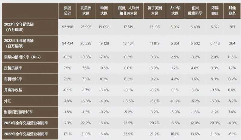 雀巢今年也有不错的表现,业绩增长约29亿美元。从雀巢集团2023年年报来看,全年财报总销售额减少1.5%,至930亿瑞士法郎,有机增长率为7.2%,定价贡献率为7.5%。北美地区有机增长率为7.3%,定价贡献率为7.6%,雀巢认为这反映了消费者需求疲软、产能限制的现状以及加拿大冷冻食品和比萨业务的颓势。