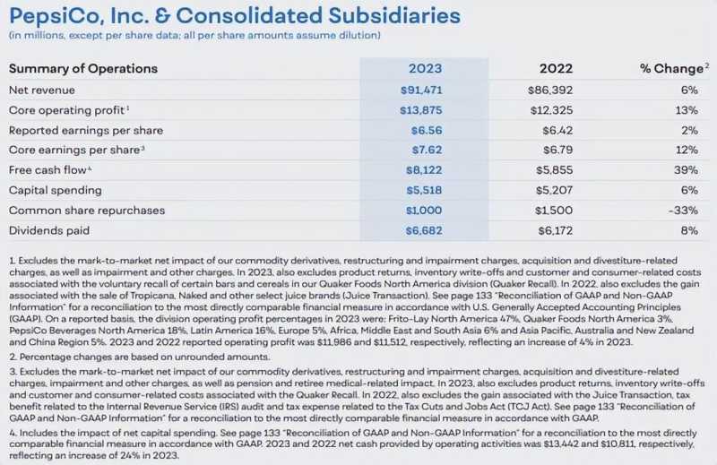 据百事2023年年报,百事公司的净收入相比于2022年有6%的增长。从业务上看,百事公司净收入有59%来自食品相关业务,41%来自饮料相关业务。从区域上看,百事公司北美地区的净收入占所有区域净收入的50%以上。百事公司董事会主席兼首席执行官在Ramon L. Laguarta在年报中提到:“2023年百事有机收入增长9.5%,这让我们(即百事)三年复合年均有机增长率达到11%……食品业务的有机收入增长10%,饮料业务的有机收入增长8%。”
