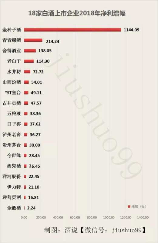 值得一提的是,金种子的净利增幅为1144.09%,净利暴增。同时,青青稞、舍得、老白干的净利增幅都在“三位数”,分别为216.01%、138.05%和114.3%。