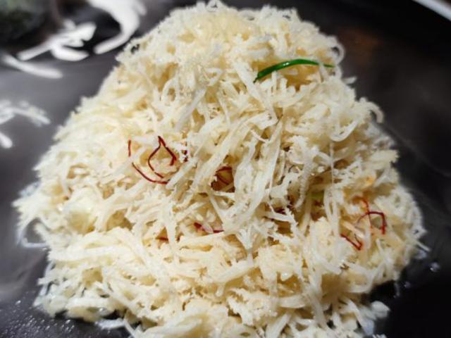 这是一道特别考验厨师刀工与火候的经典湘菜,首先把质地洁白如玉的牛百叶切成发丝般的细丝,然后急火爆炒而成。成菜后,菜品色泽白净、百叶细如发丝、质地清脆鲜嫩、口感咸鲜辣酸。