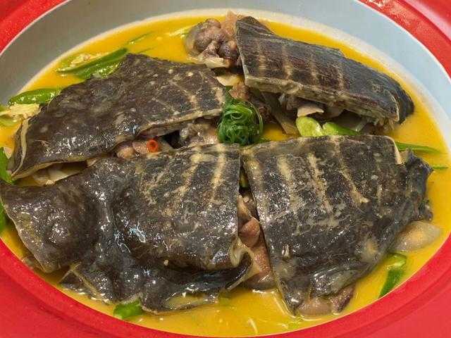 水鱼裙边改刀切块,水发冬菇去蒂。剩余的水鱼肉及五花肉、鸡肉均切成稍大点的块,焯水氽烫去腥,下入砂锅内,加入葱、姜、清汤,调味后大火烧沸,小火煨至五成熟。这时下入水鱼裙边、水发冬菇,煨至水鱼裙边软糯。