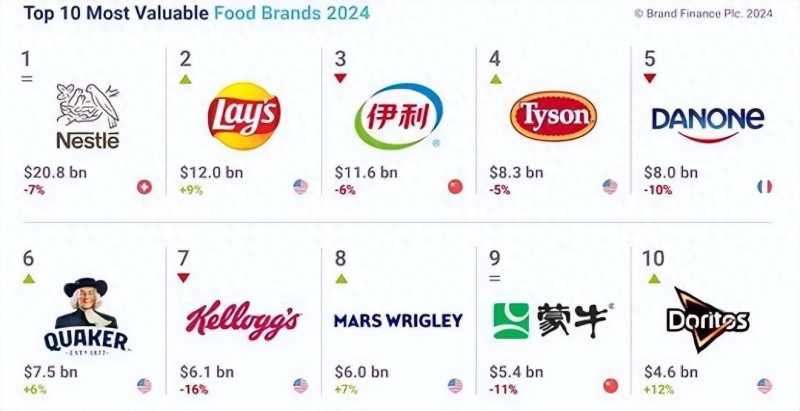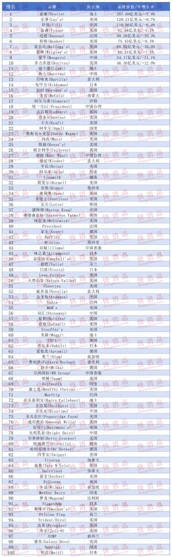 在全球食品品牌价值100强(Food 100)榜单上,雀巢、乐事、伊利排名前三位。