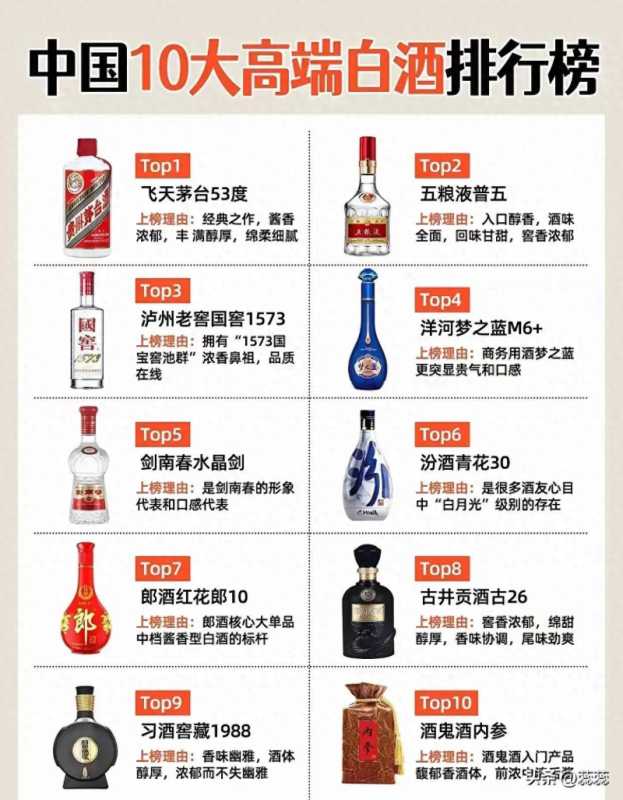 中国十大白酒品牌,大家快来了解一下吧。 2025年综合市场口碑、品牌影响力及行业评测的中国十大白酒品牌(排名不分先后)各具特色,是白酒行业的核心代表:茅台作为大曲酱香型白酒鼻祖,产自贵州茅台镇,凭借酱香突出、回味悠长的特质成为中国白酒名片,飞天 ... 食品饮料11-26