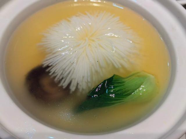 同样考验刀工的还有这道花菇无黄蛋,这道菜造型美观,像一朵白菊花,汤鲜味美,爽滑细腻,营养丰富。这道菜制作非常考究,要取出蛋黄,蛋清内加入高汤后再灌入蛋壳,上锅蒸熟,再切成菊花状,花菇炒熟后,倒入高汤调味后,淋到无黄蛋上,即可享用。
