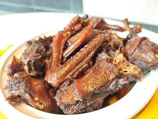 很多外地人看到雷公鸭这个名字会好奇,其实就是因为颜色暗红发黑,像是被雷劈过一样而得名。选用当地的麻鸭,先把鸭子处理干净,剁成小块,起锅烧油,炒香八角、桂皮、姜片,放入鸭子炒干水分,再炖煮入味,最后再上锅蒸制而成,做法非常复杂。