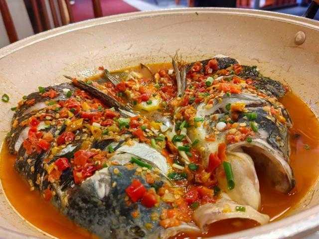剁椒鱼头是湘菜的代表菜之一,香辣下饭,鲜香嫩滑,非常受欢迎,当地人下馆子常点,会做菜的湖南人都会做这道菜。这道菜属于一道蒸菜,选用雄鱼鱼头为主料,这种鱼头肉多味美,先腌制入味,放到蒸锅中蒸制几分钟,倒出盘子里的水,再起锅烧油,炒香剁椒、姜蒜末,浇到鱼头上,再蒸10分钟,淋入热油即可。