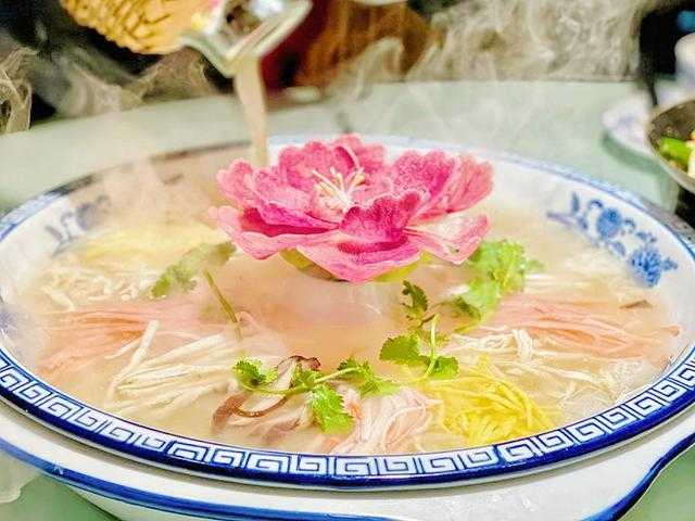 牡丹燕菜是洛阳的传统名菜,是当地水席的招牌菜,以萝卜、火腿、鸡蛋、豆皮、高汤等普通食材烹饪而成,味道酸辣可口,非常美味,相传唐朝武则天曾品尝并赐名为“燕菜”,这道菜的关键在于食材的处理和汤头的熬制,必须用精心熬制的高汤才行。